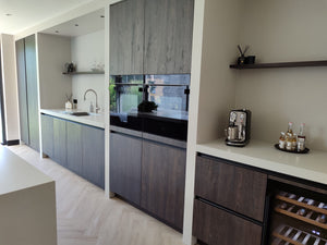 In de achterwand van deze luxe woonkeuken is de Livolo dubbele wandcontactdoos een praktische en elegante oplossing. Deze contactdoos is zorgvuldig ingebouwd en biedt u eenvoudig toegang tot stroompunten voor uw keukenapparatuur. Dankzij het moderne ontwerp sluit de wandcontactdoos perfect aan bij de strakke uitstraling van uw keuken. Een betrouwbare en nette afwerking die zowel gemak als een verzorgde uitstraling garandeert.