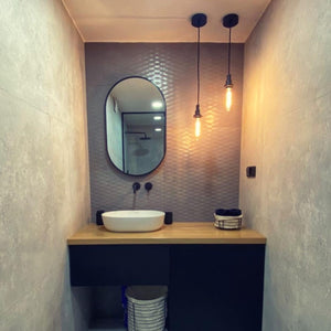 De combinatie van een eikenhouten blad met zwarte tinten geeft deze badkamer een warme uitstraling. De dimbare zwarte hanglampen, bediend met een combinatie van dimmer en wandcontactdoos, creëren een sfeervolle ambiance.