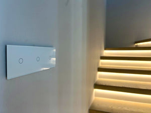 Op de foto ziet u een Livolo 3-voudige touchschakelaar, gecombineerd met sfeervolle trapverlichting op de achtergrond. Perfect voor een strak en stijlvol interieur met slimme bediening.