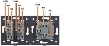 De Livolo puls wipschakelaar beschikt over drie aansluitpunten: COM, NO en NC. Deze maken het mogelijk om de schakelaar op verschillende manieren te integreren in elektrische of domoticasystemen: