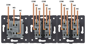 De Livolo puls wipschakelaar beschikt over drie aansluitpunten: COM, NO en NC. Deze maken het mogelijk om de schakelaar op verschillende manieren te integreren in elektrische of domoticasystemen: