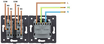 De Livolo puls wipschakelaar beschikt over drie aansluitpunten: COM, NO en NC. Deze maken het mogelijk om de schakelaar op verschillende manieren te integreren in elektrische of domoticasystemen: